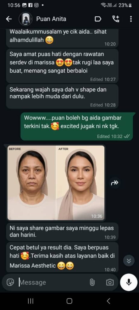 “Lepas buat rawatan Serdev, saya nampak perubahan pada bentuk muka yang lebih kemas dan lebih terangkat. Bahagian pipi dan jawline nampak lebih defined, jadi muka kelihatan lebih kecil dan segar.”- Puan Maria, 56 tahun