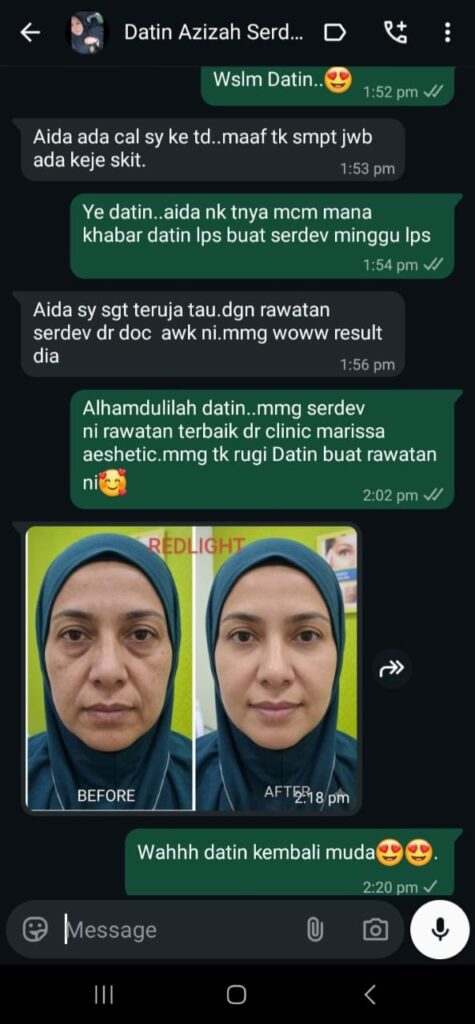 “Serius tak sangka eyebag saya boleh berubah macam ni 😭. Dulu bawah mata nampak gelap dan berkedut, walaupun dah pakai eye cream macam-macam tetap tak banyak perubahan. Lepas buat rawatan eyebag di sini, baru nampak hasil yang betul-betul ketara. Sekarang bawah mata nampak lebih cerah, eyebag dah banyak berkurang dan muka nampak lebih fresh. Orang pun tegur nampak lebih muda!” – Puan Azizah, 50 tahun
