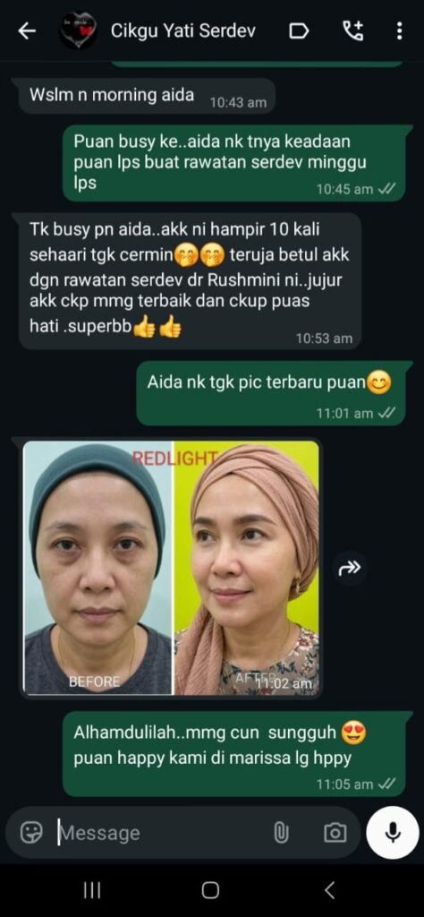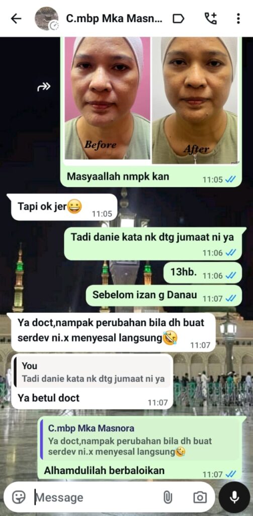 “Lepas buat rawatan Serdev, saya nampak perubahan yang sangat cantik pada wajah saya. Pipi nampak lebih penuh, terangkat, dan muka kelihatan lebih berseri. Yang paling saya suka, hasil dia sangat natural dan buat saya nampak lebih muda tanpa nampak pelik. Memang berbaloi.” – Puan Ara 48 tahun