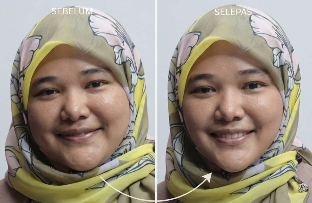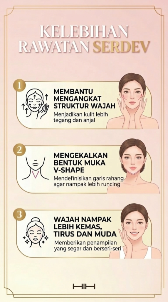Dengan teknik SERDEV, rawatan ini membantu mengangkat semula otot dan struktur wajah. Apabila bahagian pipi, rahang, dan kontur wajah terangkat semula, bentuk muka akan kelihatan lebih kemas dan V-shape dapat dikekalkan.
